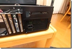 ケースの上蓋を外す。ハードディスクラックや光学ドライブ用ラックが見える。
